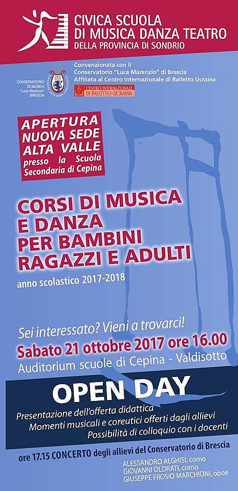 Aprirà il 6 novembre la nuova sede dell'Alta Valle della Civica Scuola di Musica Danza e Teatro. Le lezioni si svolgeranno presso il plesso scolastico di Cepina e prevedono un'ampia varietà di corsi di musica e di danza per bambini, ragazzi e adulti. Open Day: sabato 21 ottobre alle 16.00. Informazioni e iscrizioni: 0342 213136 | civica@musica-viva.it | www.musica-viva.it |