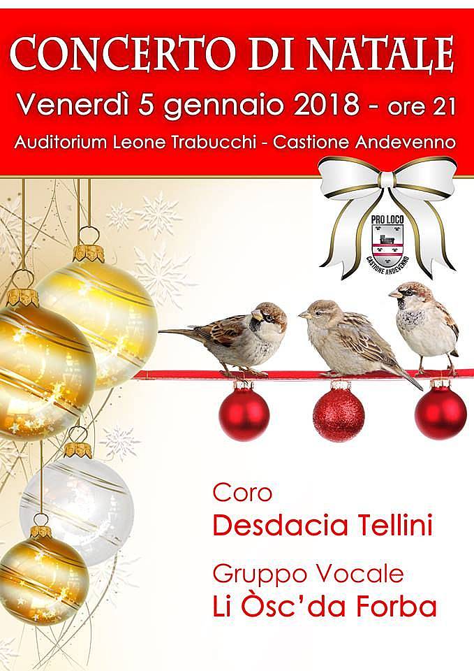 Concerto di Natale Venerdi 5 Gennaio 2018core 21.00 presso Auditorium LEone Trabucchi Castione Andevenno Coro Desdacia Tellini Gruppo Vocale Li Osc da Forba |