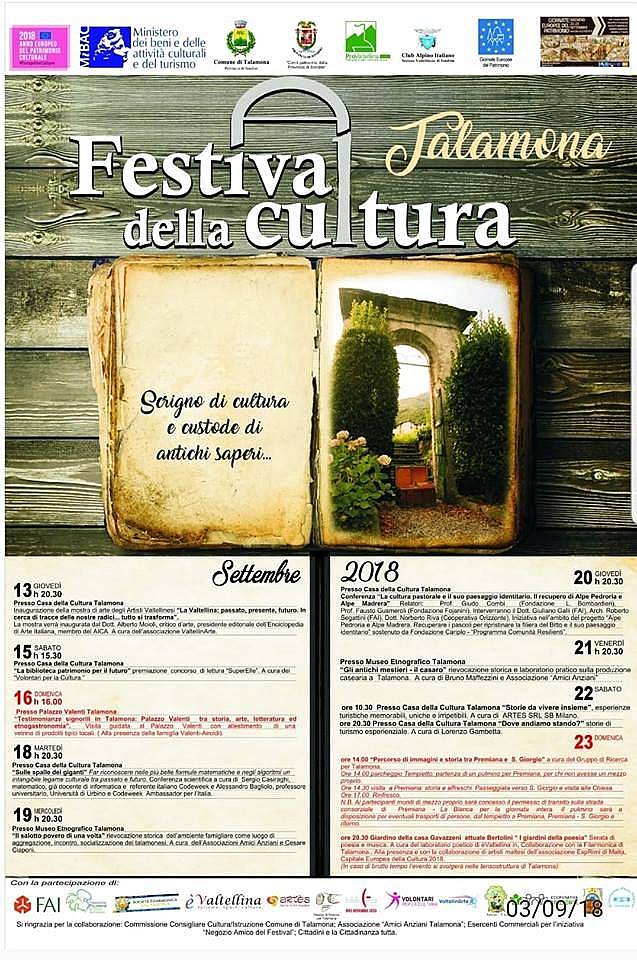 Festival della cultura"Talamona Scrigno di Cultura"Dal 13 Settembre al 23 Settembre 2018 a Talamona