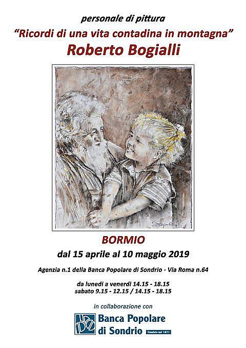 Dal 15 aprile al 10 maggio a Bormio, presso l'agenzia n.1 della Banca Popolare di Sondrio (Via Roma 64), Roberto Bogialli presenta la sua personale di pittura "Ricordi di una vita contadina in montagna". La mostra sarà aperta da lunedì a venerdì dalle 14.15 alle 18-15, il sabato dalle 9.15 alle 12.15 e dalle 14.15 alle 18-15. L'artista presenzierà la mostra tutti i sabati. Per informazioni roberto.bogialli@gmail.com - 0342 61 03 81 |