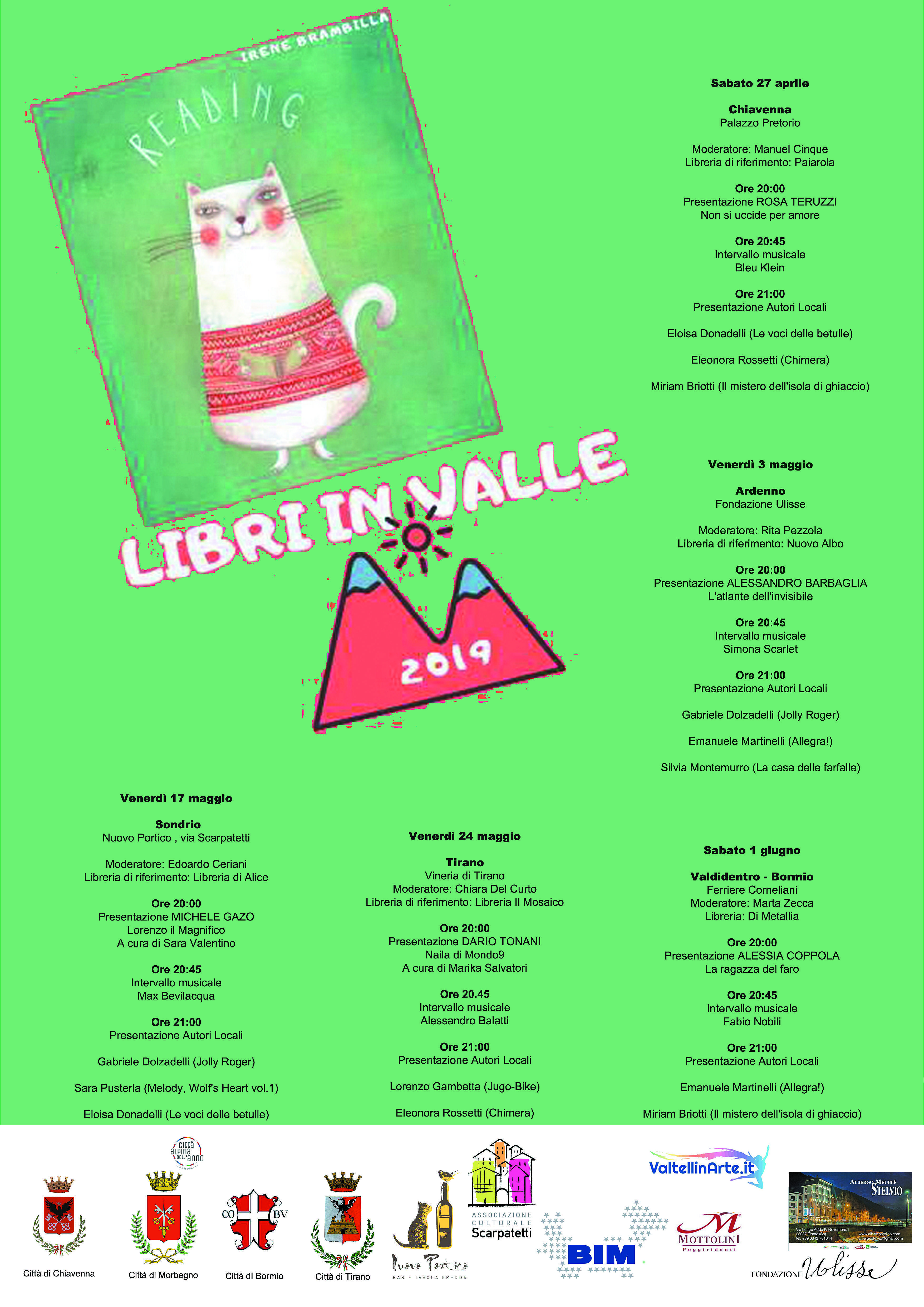 Lo scopo è la sensibilizzazione del territorio alla lettura e alla scrittura ...tutto ciò che li segue. Libri in Valle significa raggruppare la valle ed promuovere racconti, fantasie ed tanta cultura portando a riscoprire un mondo letterario valtellinese sconosciuto per molti. Manifestazione che cerca di offrire spazi, lanciare sfide, trovare affinità e arditi incroci disciplinari per portare autori anche apparentemente distanti a condividere il palco e disporsi a un confronto aperto, a volte imprevedibile, sulle questioni sentite come più urgenti e vicine dalla comunità di lettori che si dà appuntamento in Valtellina e Valchiavenna. Dove troviamo fianco a fianco , narratori e musicisti con lo stesso senso del ritmo, architetti e scrittori che prendono la città come misura del mondo, poeti e drammaturghi che scavano dentro le parole, fisici e studiosi di letteratura che si confrontano sugli statuti delle reciproche discipline, scrittori migranti di prima e seconda generazione, o anche scrittori legati da lunga amicizia che proprio a Libri in Valle decidono di dar sfogo a una comune passione letteraria, intraprendere un progetto da tempo rimandato o ricominciare un discorso lasciato in sospeso. Tutto questo diventa possibile. Il campo è aperto a situazioni ancor più orientate al coinvolgimento attivo del pubblico e a un'invenzione più libera e partecipata, capaci di mettere in circolo e di produrre nuove energie creative. PROGRAMMA