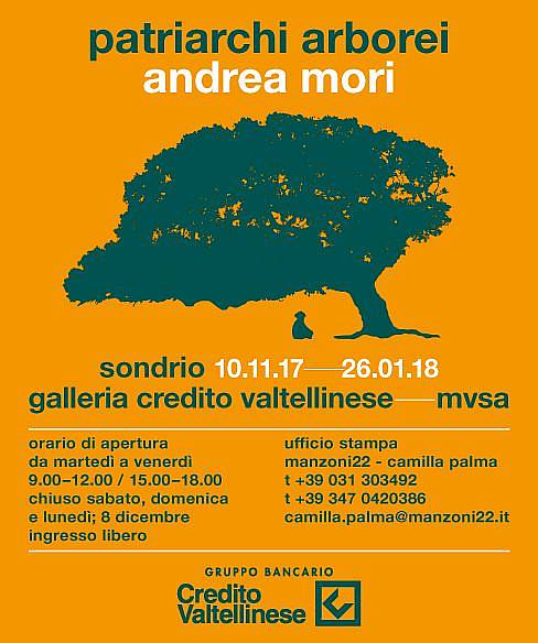 PATRIARCHI ARBOREIAndrea Mori​ Sedi: Galleria Credito Valtellinese - piazza Quadrivio, 8 - Sondrio MVSA, Palazzo Sassi de' Lavizzari - Via M. Quadrio, 27 - Sondrio Durata mostra: 10 novembre 2017 – 26 gennaio 2018 Inaugurazione: giovedì 9 novembre 2017, ore 18.30 Sala dei Balli di Palazzo Sertoli Orari e ingressi: da martedì a venerdì h. 9.00 – 12.00 / 15.00 – 18.00 - chiuso sabato, domenica e lunedì; 8 dicembre - INGRESSO LIBERO Informazioni al pubblico: Galleria Gruppo Credito Valtellinese - galleriearte@creval.it - www.creval.it