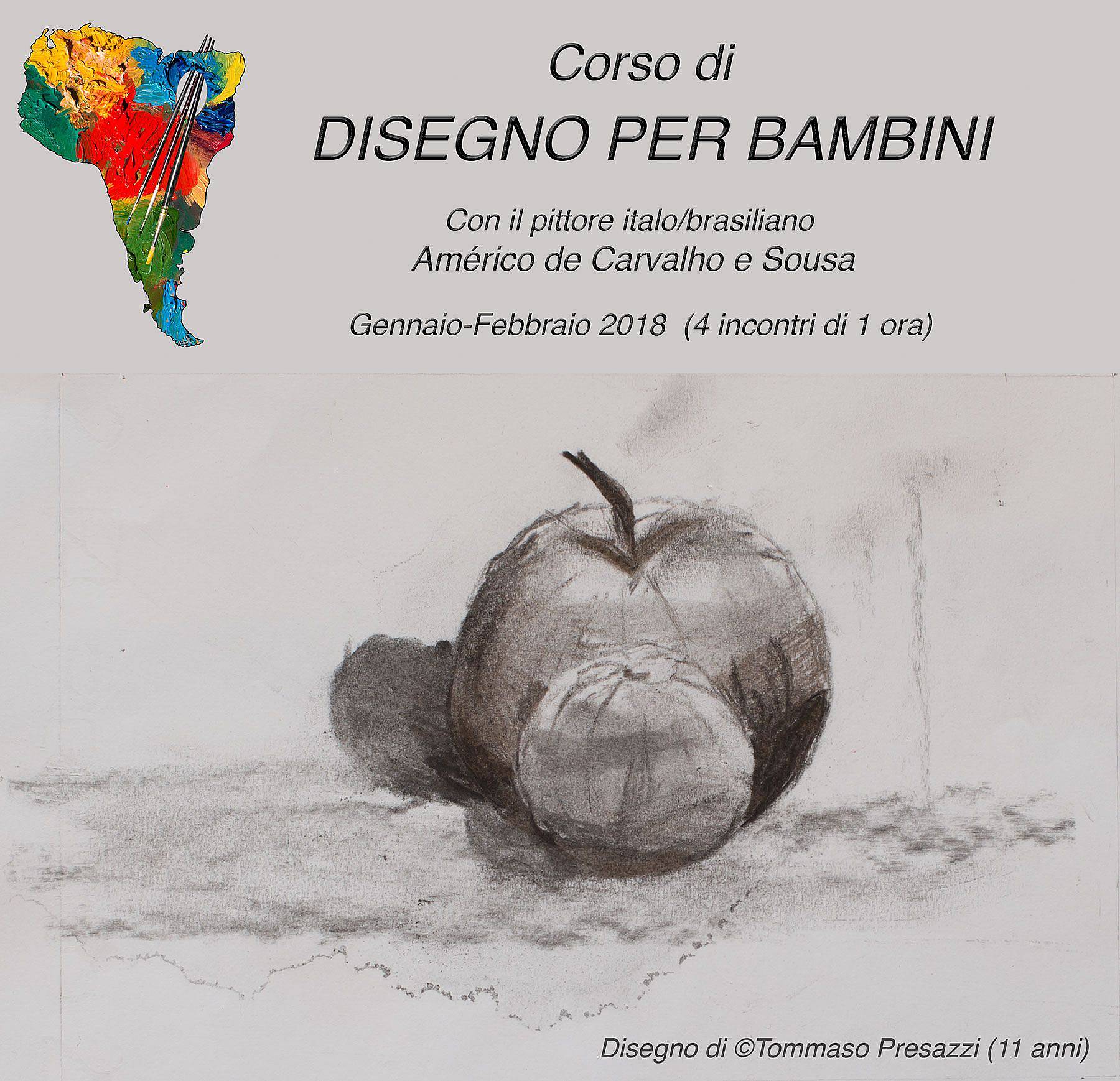 Le lezioni attualmente in svolgimento Américo nell'inverno 2018 ha tenuto lezioni di disegno a 3 gruppi di bimbi (di età compresa tra i 7 e i 11 anni). Il successo di tali lezioni, confermato dall’entusiasmo sia dei bambini che dei genitori, è dovuto non solo alle conoscenze tecnico/didattiche di Américo e alla sua particolare capacità di relazionarsi coi bambini, ma anche al fatto che, a differenza di ciò che avviene comunemente, viene sviluppato molto il lato tecnico, e non soltanto quello creativo. Cliccare qui per vedere i disegni a matita fatti dai bambini che hanno seguito le lezioni di Américo. Cliccare qui per vedere quelli fatti a carboncino. Si tratta ovviamente di bambini “comuni” cioè senza una speciale predisposizione al disegno.