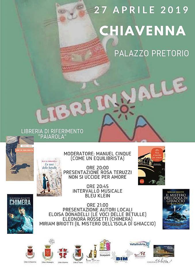 Lo scopo è la sensibilizzazione del territorio alla lettura e alla scrittura ...tutto ciò che li segue. Libri in Valle significa raggruppare la valle ed promuovere racconti, fantasie ed tanta cultura portando a riscoprire un mondo letterario valtellinese sconosciuto per molti. Manifestazione che cerca di offrire spazi, lanciare sfide, trovare affinità e arditi incroci disciplinari per portare autori anche apparentemente distanti a condividere il palco e disporsi a un confronto aperto, a volte imprevedibile, sulle questioni sentite come più urgenti e vicine dalla comunità di lettori che si dà appuntamento in Valtellina e Valchiavenna. Dove troviamo fianco a fianco , narratori e musicisti con lo stesso senso del ritmo, architetti e scrittori che prendono la città come misura del mondo, poeti e drammaturghi che scavano dentro le parole, fisici e studiosi di letteratura che si confrontano sugli statuti delle reciproche discipline, scrittori migranti di prima e seconda generazione, o anche scrittori legati da lunga amicizia che proprio a Libri in Valle decidono di dar sfogo a una comune passione letteraria, intraprendere un progetto da tempo rimandato o ricominciare un discorso lasciato in sospeso. Tutto questo diventa possibile. Il campo è aperto a situazioni ancor più orientate al coinvolgimento attivo del pubblico e a un'invenzione più libera e partecipata, capaci di mettere in circolo e di produrre nuove energie creative. PROGRAMMA