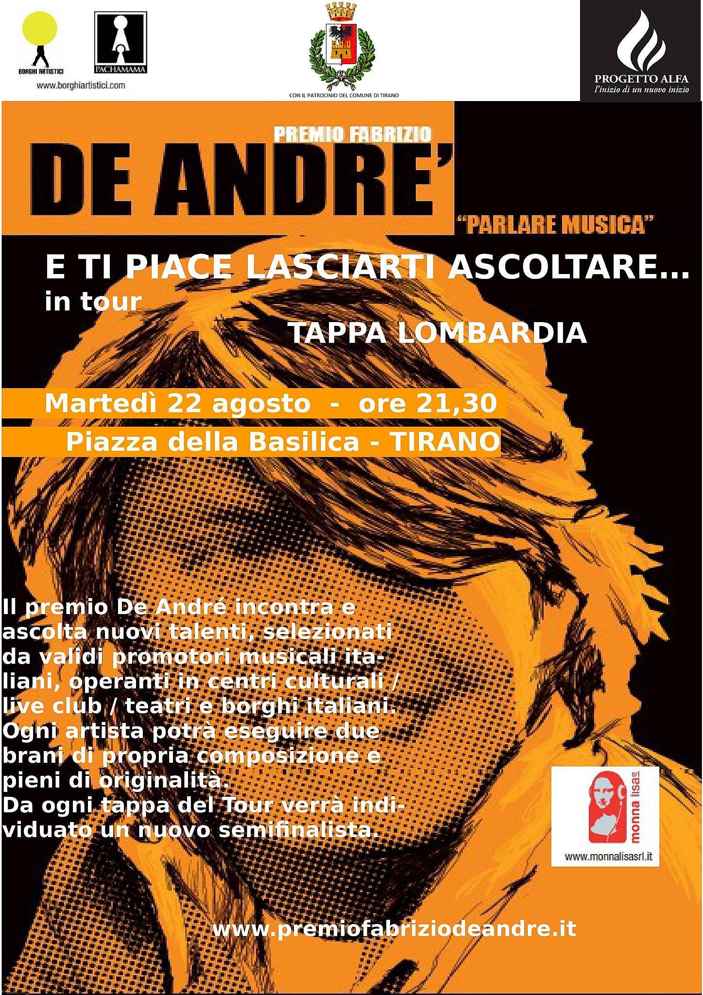 "PARLARE MUSICA"...e ti piace lasciarti ascoltare... in tour Il premio De André incontra e ascolta nuovi talenti, selezionati da validi promotori musicali italiani, operanti in centri culturali / live club / teatri e borghi italiani. Ogni artista potrà eseguire due brani di propria composizione e pieni di originalità. Da ogni tappa del tour verrà individuato un nuovo semifinalista. |